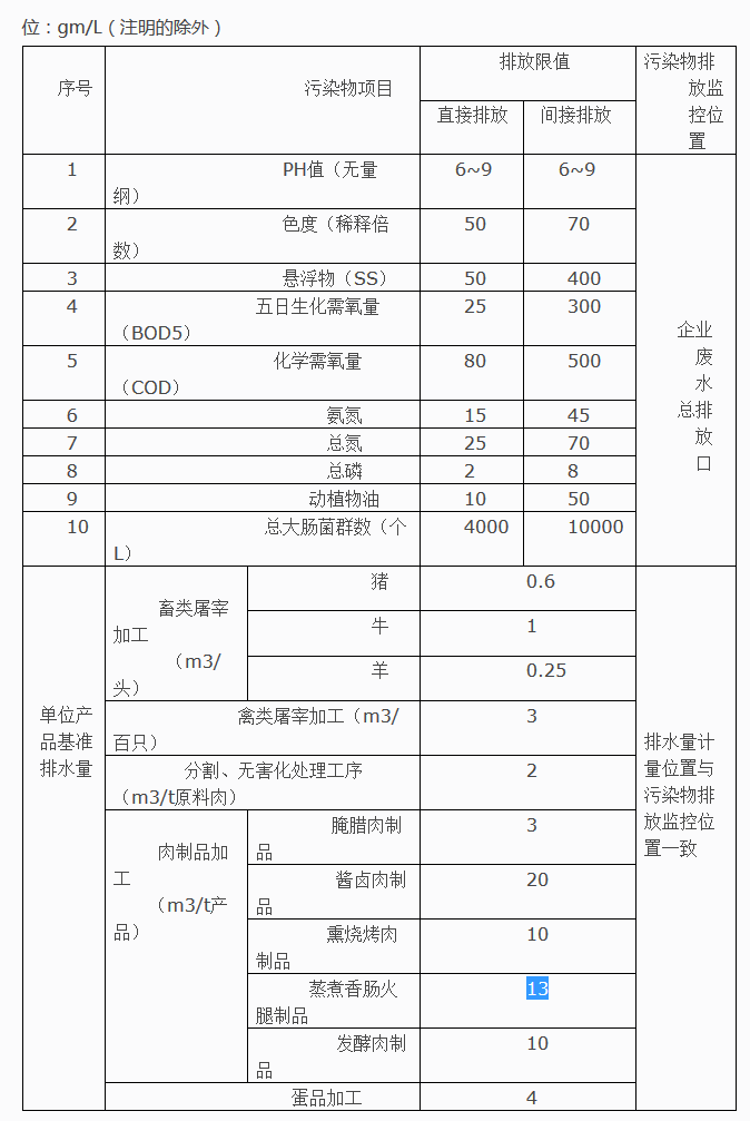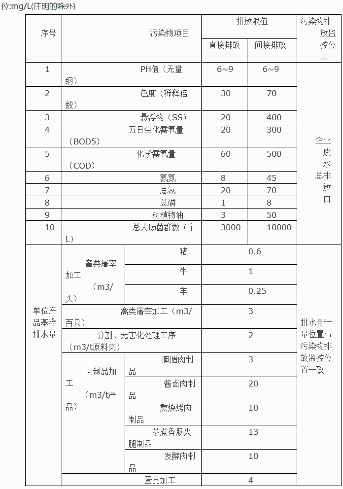 本標準規定了屠宰與肉類加工工業企業或生產設施水污染物排放控制要求,檢測等內容。 1適用范圍 本標準適用于現有屠宰與肉類加工工業建設項目的環境影響評價、環境保護實施設計、竣工環境保護驗收及其投產后的水污染物排放管理。 本標準適用于法律允許的污染物排放行為。新設立污染源的選址和特殊保護區域內現有污染源的管理,按照《中華人民共和國水污染防治法》《中華人民共和國海洋環境保護法》《中華人民共和國環境影響評價法》等法律、法規、規章的相關規定執行。 本標準規定的水污染物排放控制要求適用于企業直接或間接向其法定邊界外排放水污染物的行為。 2術語和定義 下列術語和定義使用于本標準 2.1 屠宰與肉類加工工業 包括畜禽屠宰、肉制品及副產品加工。畜禽屠宰指對各種畜禽進行宰殺,以及鮮肉分割、冷凍等保鮮活動(不包括商業冷藏)。肉制品及副產品加工指主要以各種畜、禽肉為原料加工肉制品,以及畜、禽副產品的加工活動。 2.2 現有企業 指本標準實施之日前,以建成投產或環境影響評價文件已通過審批的屠宰與肉類加工企業及生產設施。 2.3 新建企業 指本標準實施之日起,環境影響評價文件通過審批的新建、改建、擴建屠宰與肉類加工工業建設項目。 2.4 排水量 指生產設施或企業向企業法定邊界以外排放的廢水的量。包括與生產有直接或間接關系的各種外排廢水(含廠區生活污水、冷卻廢水、廠區鍋爐和電站排水等)。 2.5 單位產品基準排水量 指用于核定水污染物排放濃度而規定的生產單位產品的廢水排量上限值。 2.6 直接排放 指排污單位直接向環境水體排放污染物的行為。 2.7 間接排放 指排污單位向公共污水處理系統排放污染物的行為。 2.8 公共污水處理系統 指通過納污管道等方式收集廢水,為兩家以上排污單位提供廢水處理服務并且排水能夠達到相關排放標準要求的企業或機構,包括各種規模和類型的城鎮污水處理廠、區域(包括各類工業園區、開發區、工業聚集地等)廢水處理廠等,其廢水處理程度應達到二級或二級以上。 3水污染物排放要求 3.1 自2019年1月1日起,新建企業執行表1規定的水污染物排放限值。 3.2 自2022年1月1日起,年屠宰量小于2萬頭豬、0.3萬頭牛、3萬只羊、200萬只雞,100萬只鴨鵝的現有企業執行表1規定的水污染物排放限值;其他現有企業自2020年1月1日起執行表1規定的水污染物排放限值。 3.3 表1水污染物排放限值及單位產品基準排水量