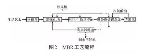 MBR主體工藝 工藝原理 膜生物反應(yīng)器(Membrane Biore-actor,簡(jiǎn)稱MBR)技術(shù)是膜分離技術(shù)和活性污泥法相結(jié)合的工藝。與活性污泥法有所不同,其不需要利用沉淀池實(shí)現(xiàn)固液分離,而是借助中空纖維膜替代沉淀池,因此其固液分離能力更加突出。 MBR工藝特點(diǎn) MBR處理工藝能適應(yīng)各種水質(zhì),并且具有良好的沖擊負(fù)荷能力。處理池中采用新型彈性立體填料,比表面積較大,更容易實(shí)現(xiàn)微生物掛膜及脫膜,在相同的有機(jī)物負(fù)荷條件下,其去除有機(jī)物的效果更加明顯,能提高空氣中的氧在水中的溶解度;其工藝簡(jiǎn)單,不需要設(shè)置過(guò)濾池、沉淀池,可有效節(jié)約土地資源;同時(shí),可有效減少水力的停留時(shí)間,減少污泥排放量,進(jìn)而降低污泥處理成本。 MBR工藝流程 如圖 2 所示,污水經(jīng)格柵井流入調(diào)節(jié)池后經(jīng)提升泵進(jìn)入生物反應(yīng)池,借助PLC控制器開啟鼓風(fēng)機(jī)進(jìn)行充氧作業(yè),生物反應(yīng)池出水經(jīng)循環(huán)泵進(jìn)入膜分離處理環(huán)節(jié),污水返回調(diào)節(jié)池。反沖洗泵借助清水池中的處理水達(dá)到反沖洗膜處理設(shè)備的目的,同時(shí)反沖污水返回調(diào)節(jié)池。提升泵開啟與閉合由反應(yīng)池的水位進(jìn)行控制。膜單元的過(guò)濾操作與反沖洗操作,能通過(guò)手動(dòng)與自動(dòng)兩種控制方式實(shí)現(xiàn)。